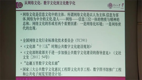 主講嘉賓柯平教授分享了題為“數(shù)字中國與文化強(qiáng)國背景下的文化數(shù)字化國家戰(zhàn)略:學(xué)科使命與行業(yè)發(fā)展思考”的學(xué)術(shù)報(bào)告,分析了數(shù)字中國、文化強(qiáng)國以及《關(guān)于推進(jìn)實(shí)施國家文化數(shù)字化戰(zhàn)略的意見》發(fā)布的背景下,公共文化服務(wù)和文化產(chǎn)業(yè)迎來的新機(jī)遇。