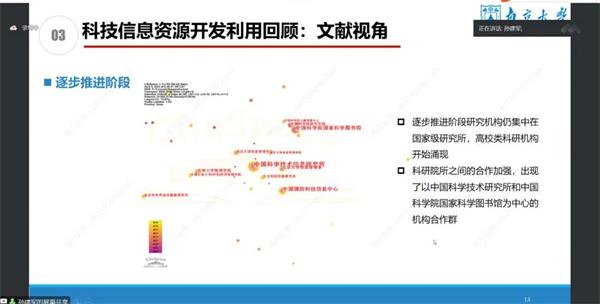 孫建軍教授作了題為“新時期科技信息資源開發利用的若干思考”的報告,簡要回顧了科技信息資源開發利用的發展情況,并從國家戰略需求、數智賦能環境等角度分析了新時期科技信息資源開發利用相關機遇與挑戰,結合相關案例分析了科技信息資源開發利用的場景化應用,并對面向未來的科技信息資源開發利用提出了諸多思考。