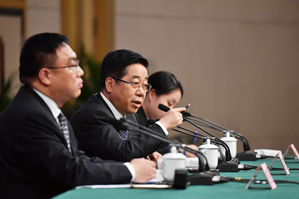3月12日,十二屆全國人大五次會議新聞中心舉行記者會,陳寶生(中)回答記者提問。 新華社 圖