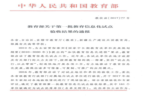 根據《教育部關于第一批教育信息化試點驗收結果的通報》(教技函[2017]77號)文件,我院被確定為試點優秀單位,這也是甘肅省高職院校唯一獲此殊榮的單位。文件中指出:獲評優秀單位主動作為、積極投入、創新機制、扎實實踐、成效明顯,很多先進經驗和典型模式通過現場會、培訓班、宣傳冊等平臺,被全國各地學習借鑒,輻射效應凸顯。