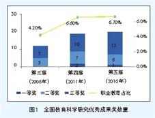 2016年,教育部頒發(fā)第五屆全國(guó)教育科學(xué)研究?jī)?yōu)秀成果獎(jiǎng),共有298項(xiàng)成果獲獎(jiǎng)。職業(yè)教育獲獎(jiǎng)成果共20項(xiàng),其中,一等獎(jiǎng)1項(xiàng),二等獎(jiǎng)6項(xiàng),三等獎(jiǎng)13項(xiàng)。從成果類型看,著作類成果12項(xiàng),論文類成果6項(xiàng),研究報(bào)告類成果2項(xiàng)。與前兩屆相比,全國(guó)教育科學(xué)研究職業(yè)教育優(yōu)秀成果獲獎(jiǎng)總體數(shù)量逐屆遞增。