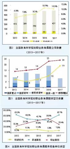 近兩年來(lái),從數(shù)量看,職業(yè)教育立項(xiàng)總數(shù)及所占比例較前3年顯著增長(zhǎng)。近5年來(lái),普通高校和職業(yè)院校研究者始終是職業(yè)教育科學(xué)研究的主要力量。就2017年的數(shù)據(jù)來(lái)看,普通高等院校承擔(dān)全國(guó)教育科學(xué)規(guī)劃職業(yè)教育課題的數(shù)量大增。