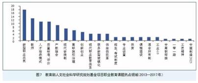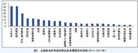 從課題內(nèi)容而言,2013—2017年全國(guó)教育科學(xué)規(guī)劃職業(yè)教育立項(xiàng)課題研究的熱點(diǎn)領(lǐng)域主要包括:職業(yè)教育人才培養(yǎng)、體制機(jī)制改革、質(zhì)量標(biāo)準(zhǔn)和評(píng)價(jià)體系、師資隊(duì)伍建設(shè)、新型職業(yè)農(nóng)民教育、職業(yè)教育精準(zhǔn)扶貧、現(xiàn)代學(xué)徒制、校企合作、中國(guó)制造2025、創(chuàng)新創(chuàng)業(yè)、職業(yè)教育體系建設(shè)等。