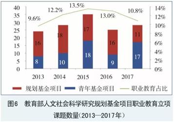 2013—2017年,教育部人文社會(huì)科學(xué)研究規(guī)劃基金項(xiàng)目中涉及職業(yè)教育的課題立項(xiàng)分別為24、28、35、25和28項(xiàng),分別占當(dāng)年教育學(xué)立項(xiàng)總數(shù)的9.6%、12.2%、13.5%、13%和10.8%。其中,規(guī)劃基金項(xiàng)目分別為16、18、17、16和11項(xiàng),青年基金項(xiàng)目分別為8、10、18、9和17項(xiàng)。