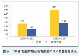 “開卷”圖書書目數(shù)據(jù)庫(kù)顯示,2013—2017 年“職業(yè)教育”為主題的教育類圖書682種,學(xué)術(shù)專著339 種,同期相比數(shù)量幾乎翻倍,增幅明顯。國(guó)家圖書館收錄的職業(yè)教育類圖書也呈現(xiàn)出同樣的趨勢(shì)。
