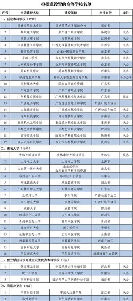 今年5月31日,教育部在其官網(wǎng)發(fā)布了《關(guān)于2018年擬批準(zhǔn)設(shè)置高等學(xué)校的公示》,公布了2018年擬批準(zhǔn)設(shè)置的高等學(xué)校名單,其中涉及擬升級(jí)為本科的高校19所,擬由學(xué)院更名為大學(xué)的高校16所。