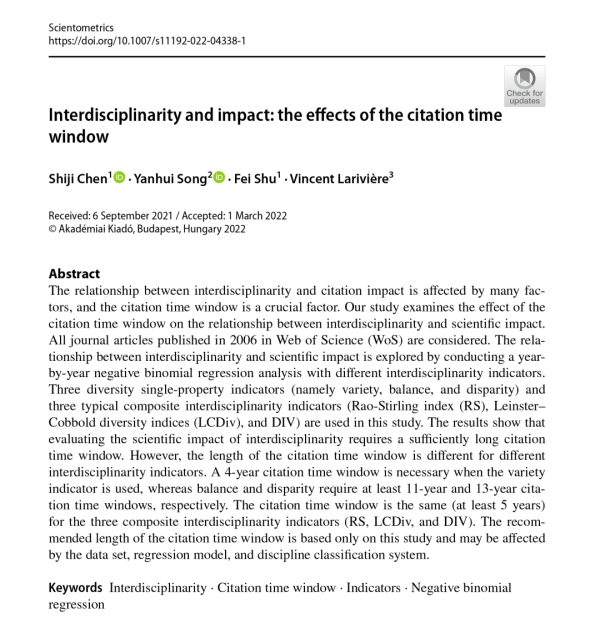 近日,我院陳仕吉教授、宋艷輝教授、舒非教授與加拿大蒙特利爾大學信息學教授Vincent Larivière合作論文《Interdisciplinarity and impact: the effects of the citation time window》發表于國際計量學頂級期刊《Scientometrics》(SSCI,影響因子3.238)。