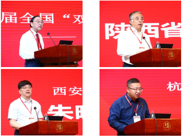 左上:邱均平資深教授主持開幕式;右上:陜西省學位委員會秘書長袁寧致辭;左下:西安建筑科技大學黨委書記朱曉渭致辭;右下:杭州電子科技大學副校長李文鈞致辭
