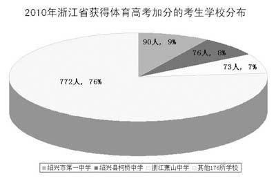 2010年浙江獲體育高考加分的考生學校分布 2010年浙江省獲得體育高考加分的考生學校分布。列在前三位的分別是紹興市第一中學(90人),紹興縣柯橋中學(76人)和浙江蕭山中學(73人),共占總人數的23.64%。今年浙江省共有179所中學有學生獲得體育加分。 本報記者 來揚制圖 本報記者 葉鐵橋 來揚實習生 周薇 張晴 程枝文 編者按 自2006年以來,中國青年報一直對高考加分中的種種不公平現象保持關注并持續報道。越來越多的事實表明,由于加分制度設計本身不夠嚴密,由于對權力的制約監督形同虛設,由于運作過程的不透明不公開,高考加分政策在一些地方被嚴重異化,成了某些權錢交易的腐敗通道,極大損害了其他考生的正當權益和整個社會的公平正義。 如果說,我們以往報道的事實僅僅是“一葉”或“一斑”,今天本報刊登的“全國高考加分研究報告”則力爭讓讀者“知秋”或“窺全豹”。 這份研究報告是本報特別報道部組織記者和實習生查閱了除臺港澳外,31個省(市、區)公開的有關高校招生政策規定和2010年加分考生公示名單,并查閱了100多所重點高校的招生章程,在統計、分析這些資料的基礎上,采訪有關專家形成的。 我們的研究發現,高考加分在許多地方成為社會管理的手段之一;高考加分泛濫,在重慶等地方,每5個考生中幾乎就有一個加分的;高考加分呈現“三集中”特征,即向區域內的相對發達地區或中心城市,以及少數中學和個別項目集中;黑龍江、湖北等一些地方公示的加分考生信息比較完整,而山東、寧夏等一些地方在關鍵信息上“遮遮掩掩”,云南等一些地方則根本沒有按規定時間公示;100多所重點高校對高考加分的態度也不一。 研究結果表明,權力和金錢越來越向高考加分領域滲透。 高考加分政策涉及千千萬萬考生及其家庭的切身利益。傾聽民聲,順應民意,清理規范高考加分政策,從源頭上遏制權錢交易腐敗現象,維護高考公平正義,尤為迫切。 “教育部的加分規定只有14種,全國各省、市、自治區卻有近兩百種”,這是媒體報道高考加分亂象時,經常被引用到的數據。 記者根據統計發現,有些地區加分項目紛繁復雜,甚至有成為普惠型加分之勢,但有些地區能獲得加分的人數在該省考生人數中所占的比例微乎其微。 這種對比,也從另一個角度體現出高考加分在我們這個時代所遭遇的困惑,加還是不加已經成為了一個問題。 同時,這一對比與那些加分大省頻頻爆出的丑聞和質疑,又構成了整個高考加分亂象這一現實圖景,不論取消與否,清理整頓高考加分已勢在必行。 重慶近5個考生中就有1人獲加分 2010年,江西省共有311651人參加高考,在江西教育網的公示中,只有441人獲得加分資格,加分人數只占考生總數的0.13%。 這441人中,體育加分64人,包括華僑歸僑子女、臺灣省籍考生、奧賽獲獎者、自謀職業退伍士兵、烈士子女等項目在內一共才74人,少數民族獲加分的共 303人。 陜西省由于取消了二級運動員加分,獲加分人數也少得可憐。雖然記者沒能找到該省少數民族獲得加分的人數,但其他所有加分項目的總人數才118人,占所有參加高考的378556考生的0.031%。 與此形成鮮明對比的是重慶、北京、河北等地。2010年重慶市高考報名人數為196759名,是全國僅有的四個增加人數的省市之一。重慶今年高考加分人數為3.37萬人,占考生總數約17.19%。從獲得加分的幾率來說,重慶是江西的約130倍。即使減去占大頭的少數民族考生13000多人,仍有兩萬多人獲得其他項目加分。 值得注意的是,今年重慶市已經大幅減少了高考加分的項目和分數,比如2009年重慶共有6.5萬人獲得高考加分,加分人數超過考生總數的30%。 除此之外還有北京。北京今年獲加分的人數近1.1萬人,占全部考生8.1萬人的1/8強。即使減去少數民族考生6700余人,仍有4000余人獲得加分。 河北也是如此。2010年,河北省高考報考人數為50.3萬人;各項優惠政策共公示5.83萬人次,占考生總數的11.6%。除少數民族加分24000余人外,仍有3萬余人獲得加分。 值得注意的是,雖然山東省今年宣稱取消所有省內制訂的高考加分政策,但是,仍有4547人獲得高考加分照顧,不過其中少數民族考生占絕大多數,有4165人,其余382人屬于其他類型加分。據報道,山東省教育招生考試院之所以要取消省內加分的“土政策”,是考慮到一些政策初衷雖然很好,但執行起來很難,很容易背離初衷,容易成為不正之風,引起群眾不滿。 加分項目各自為政 從那些加分大省(區、市)來看,可以看到加分項目在設置上各自為政,在加分分值上有多有少,在名稱上五花八門,在范圍上又千差萬別。 教育部規定,有關省(區、市)確需增加的政策性照顧項目,須經本省級普通高校招生委員會研究確定,并報教育部核準備案后方能向社會公布。于是,在教育部的加分項目基礎上,一些省、市、自治區招生委員會又制定了名目繁多的加分項目。 這些加分項目數量眾多、內容復雜。例如在《四川省2010年普通高等學校招生實施規定》中,“錄取照顧政策”長達2100余字,共16項加分大類。廣東省的體育類加分項目尤其繁多,一些項目如輪滑球、花樣輪滑、毽球等為許多人所不熟識。 有很多加分項目屬于地方政策。如河北省規定,“省授予‘教育世家’稱號的教師直系子女報考師范院校的增加20分”。黑龍江省規定,“在我省工作的省級(含)以上優秀專家的子女,在所報省內院校調