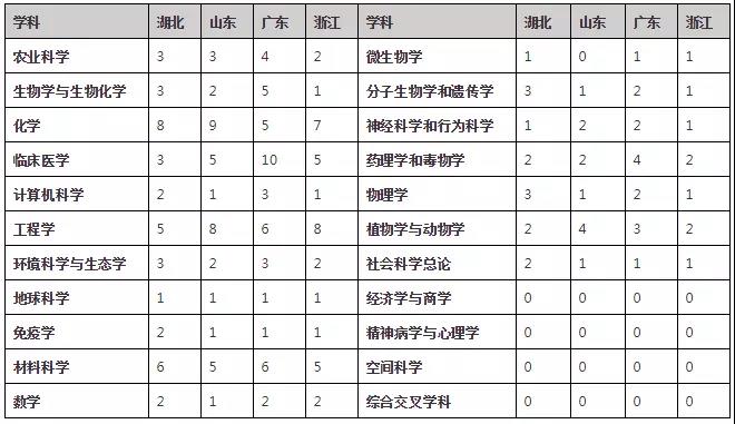 通過對湖北、山東、廣東、浙江四省份高校進入ESI數據庫中學科的分布統計得出,湖北有52個學科入選,山東有49個學科入選,廣東有61個學科入選,浙江只有45個學科入選,是入選學科數最少的省份。各省入選學科分布見表4。