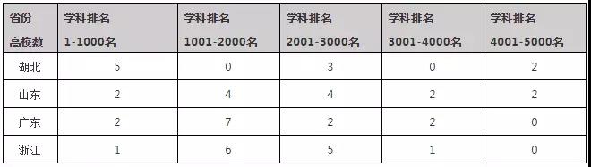 表5.湖北、山東、廣東、浙江四省份學科國際排名分布表
