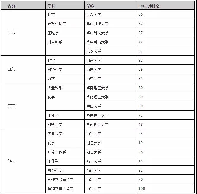 表6.湖北、山東、廣東、浙江四省份ESI全球排名前100高校一覽表
