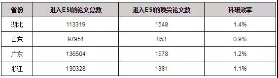 通過四省份高校進入ESI數據庫的論文總數、頂尖論文的統計,以及頂尖論文占論文總數中的比例來管窺高校科研的效率。湖北、山東、廣東、浙江四省份的論文數量及科研效率如表7所示。