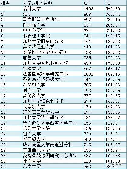 對于全球生命科學領域,在前30名中,除了馬克思普朗克學會(第3名),中國科學院(第5名),牛津大學(第12名),法國國家科學研究中心(第13名),劍橋大學(第16名),多倫多大學(第17名),倫敦大學學院(第23名),德國研究中心亥姆霍茲協會(第28名),東京大學(第30名)等9個大學/研究所以外,其他機構都是美國的,這也說明美國在生命科學領域的實力非常的強健。前二名都由美國的大學/研究所包攬(哈佛大學,美國國立衛生研究院)。