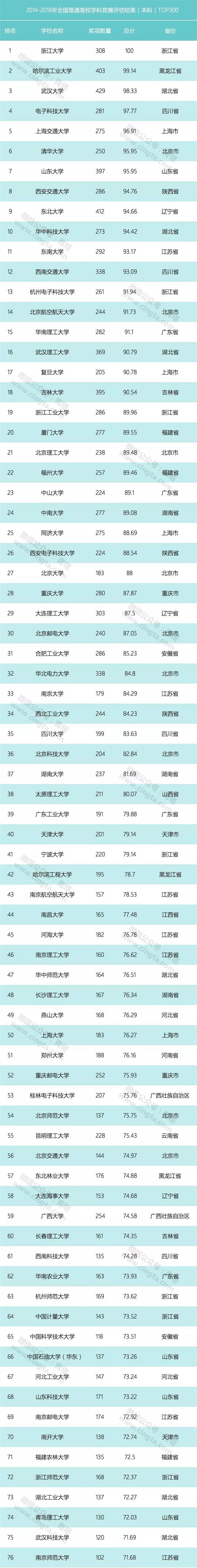 2014-2018年全國普通高校競賽評估結果(本科)TOP300排名顯示,浙江大學共有308項獎項位居第一,總得分達到100。哈爾濱工業大學共有403項獎項位居第二,總得分達到99.14。武漢大學共有429項獎項,總得分為98.33,位居第三位。電子科技大學共有281項獎項,總得分達到97.77,位居第四位。上海交通大學、清華大學、山東大學、西安交通大學、東北大學、華中科技大學等一流大學建設高校位居前十位。