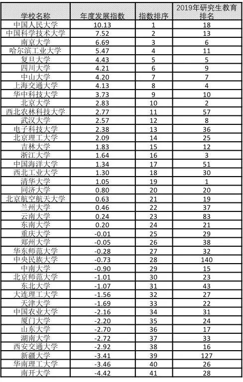 今年的雙一流建設高校發展指數與2018年度相比,已趨于平緩。41所一流大學中有24所高校發展指數為正值,雖然有17所高校為負值,但退步的幅度都很小。發展指數最高的三所大學——中國人民大學、中國科學技術大學與南京大學,均為發展基數較大的知名學府,在今年依舊擁有領先于其他高校的發展速度,實屬不易。各個院校最后的綜合得分,取決于辦學資源、教學、科研、社會影響力等各方面的協同進步。