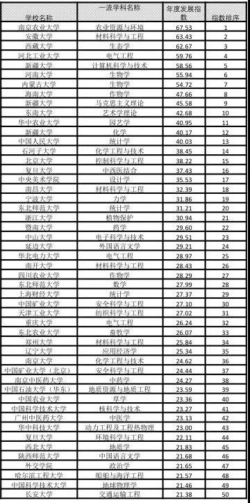 學科建設是學校發展的重中之重,也是“雙一流”建設的重要內容。今年南京農業大學的“農業資源與環境”、安徽大學的“材料科學與工程”和西藏大學“生態學”的年度發展指數值都在60以上,發展速度最快,說明一流學科建設成效明顯。從發展指數前50名的情況來看,農學門類發展較快,有10個一級學科進入前50名;從一流學科來看,材料科學與工程的發展較快,有安徽大學、南昌大學、南開大學、鄭州大學進入前列;從學校來看,新疆大學十分突出,有“計算機科學與技術”、“馬克思主義理論”以及“化學”等三個一流學科,發展態勢良好。通過學科內和學科間年度發展指數的對比,我們不僅可以看出學科內各高校的建設成效,也能看到不同學科之間的發展差異。