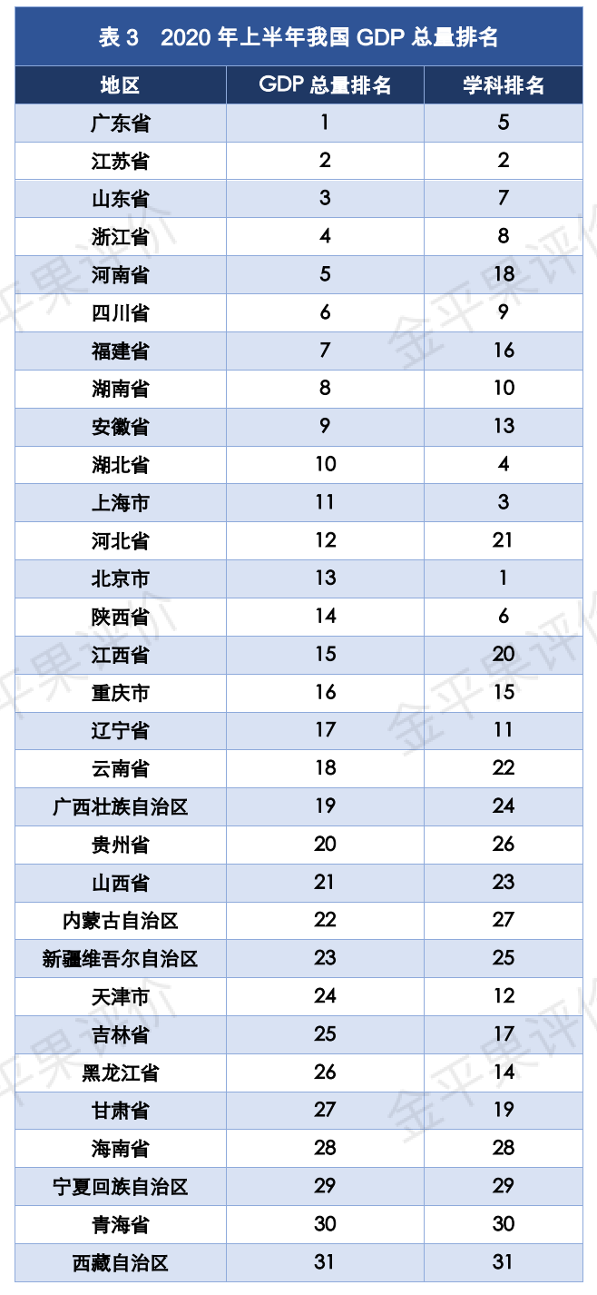 和教育歷來是一個地區持續發展的重要動力和保障,而教育的發展離不開當地經濟的大力扶持。2020上半年,在疫情的沖擊下,我國GDP地區總量排名依然平穩。具體排名如表3所示。GDP排名前十的地區中,只有江蘇省、湖北省、廣東省、浙江省、山東省、四川省和湖南省守住了學科排名前十的席位,其余的河南省、福建省和安徽省卻被擠出前十擂臺。其中GDP排名和學科排名差異最大的應屬河南省:GDP總量排名第五,學科排名僅為18。