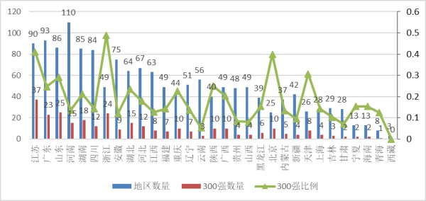 四、高職教育整體水平及300強高校數量江蘇居首,強校比例浙江第一
