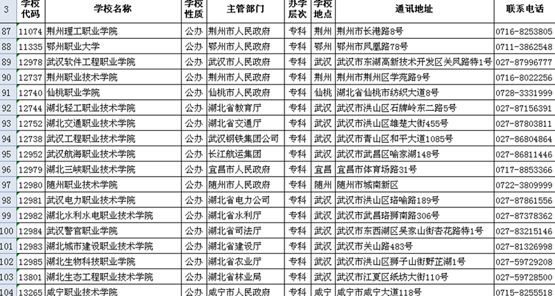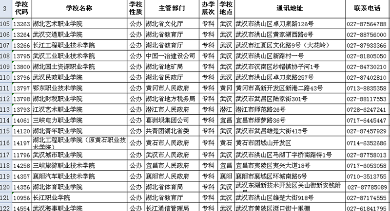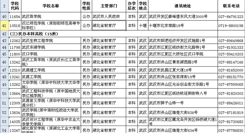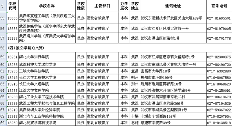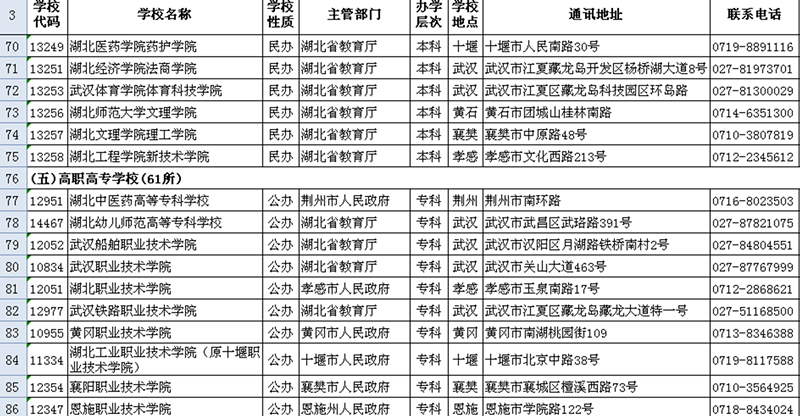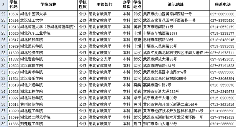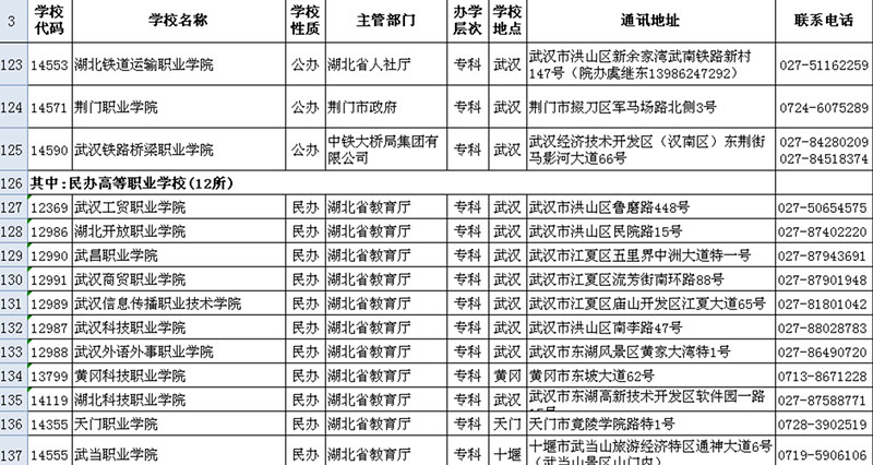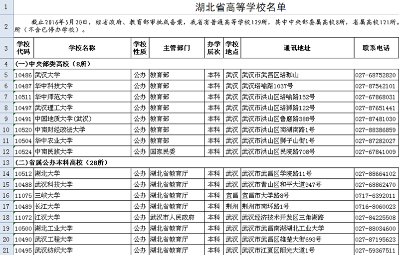省教育廳明確,截止2016年5月20日,湖北省經(jīng)教育部、省政府審批備案的普通高等學(xué)校共有129所,本科68所,高職高專61所。其中,中央部委屬高校8所、省屬公辦本科高校28所、民辦本科高校15所、獨立學(xué)院17所、高職高專學(xué)校61所、民辦高等職業(yè)學(xué)校12所。另有成人高等學(xué)校6所(不含已停辦學(xué)校)。