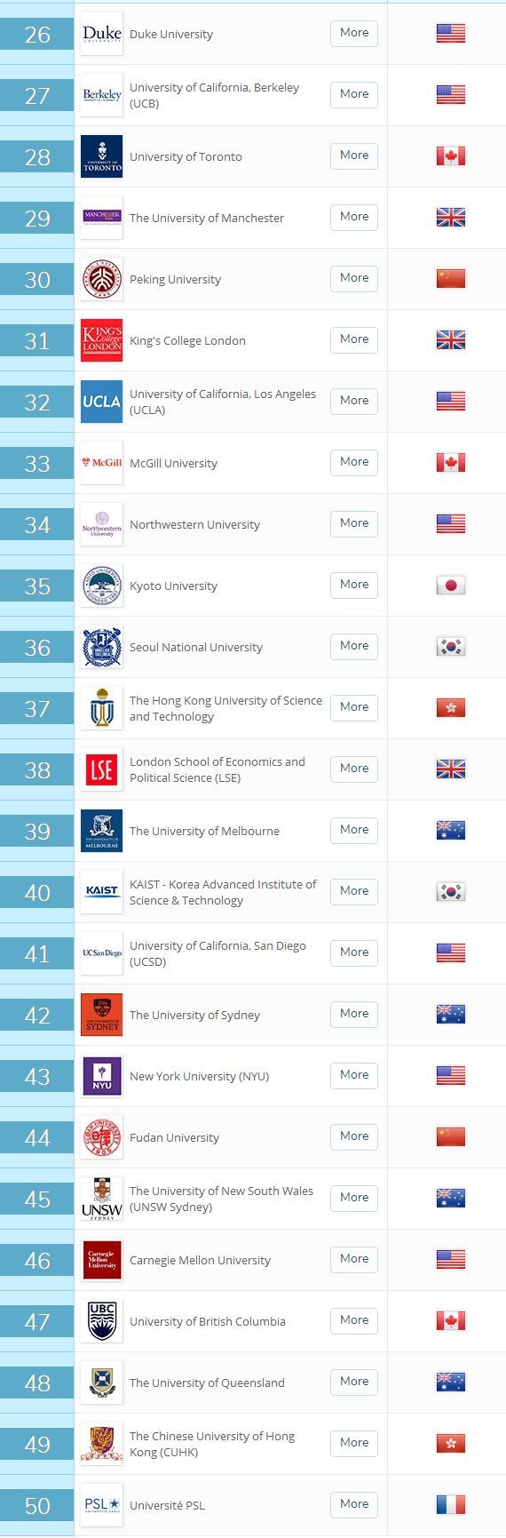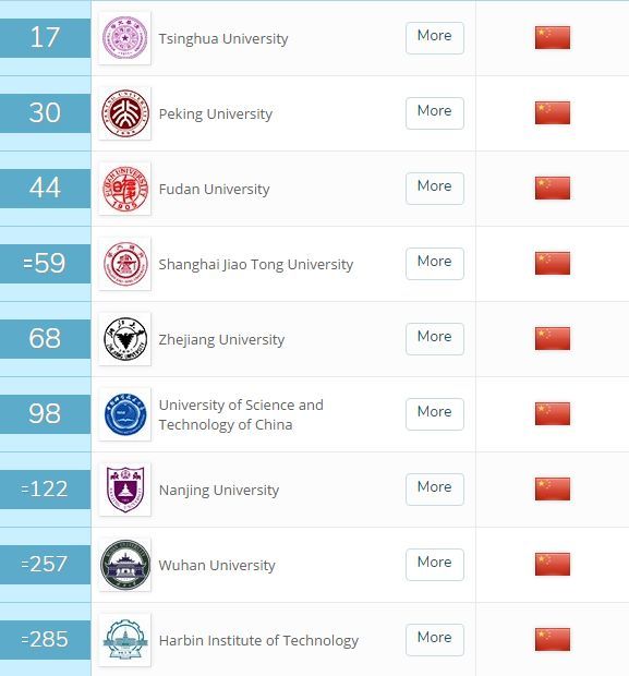 今年有六所中國大陸的大學進入QS榜單的TOP100名,值得注意的是,清華大學首次沖進前20名,位列17名,這一下,牛逼大發了!把一眾歐美名校甩在了身后。北京大學則挺進了TOP30。香港大學第25。