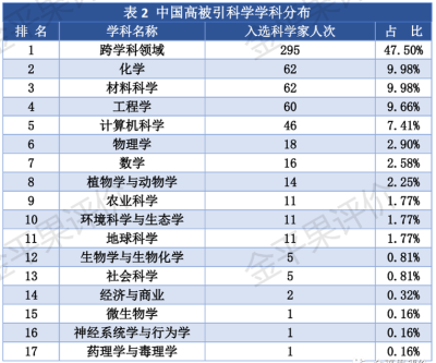 根據(jù)中國內(nèi)地上榜科學(xué)家所屬學(xué)科統(tǒng)計來看,主要涉及17個學(xué)科,且大部分集中在理工科類。跨學(xué)科領(lǐng)域的科學(xué)家人次最多,高達(dá)295,占比47.5%,化學(xué)和材料科學(xué)人次各為62,占比9.98%,并列第二,其次是工程學(xué)和計算機科學(xué),分別是60人和46人,占比分別為9.66%和7.41%。而微生物學(xué)、神經(jīng)系統(tǒng)學(xué)與行為學(xué)和藥理學(xué)與毒理學(xué)各有1人入圍。比較遺憾的是臨床醫(yī)學(xué)、免疫學(xué)、分子生物與遺傳學(xué)、空間科學(xué)、精神病學(xué)/心理學(xué)5個學(xué)科未有我國科學(xué)家入選。