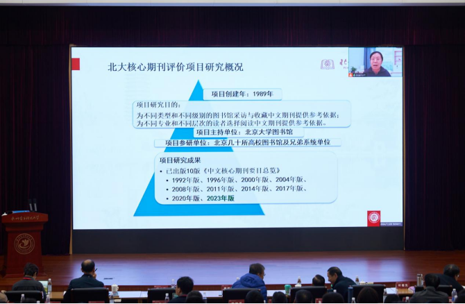 (6)北京大學圖書館文獻計量學研究室主任張俊娥研究館員作題為《北大中文核心期刊的研制特色》的專題報告
