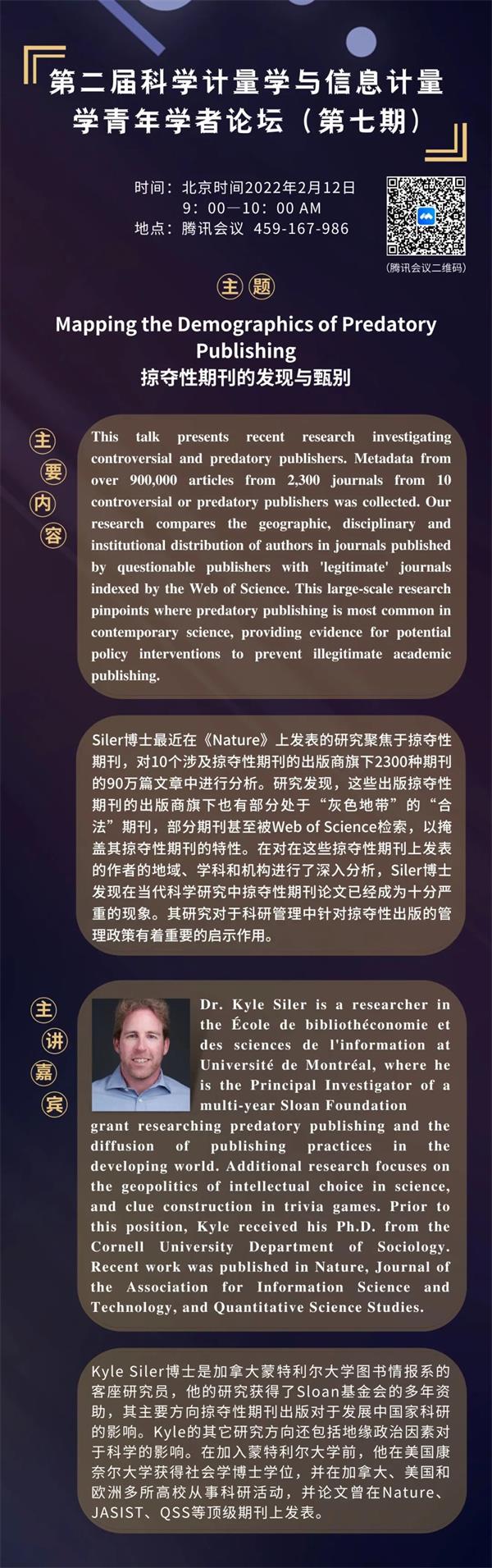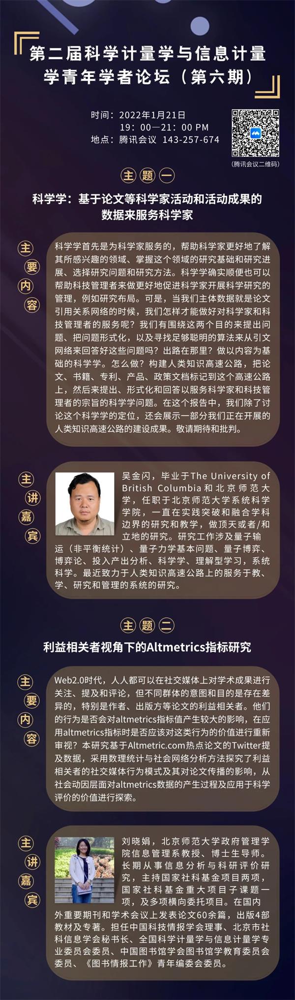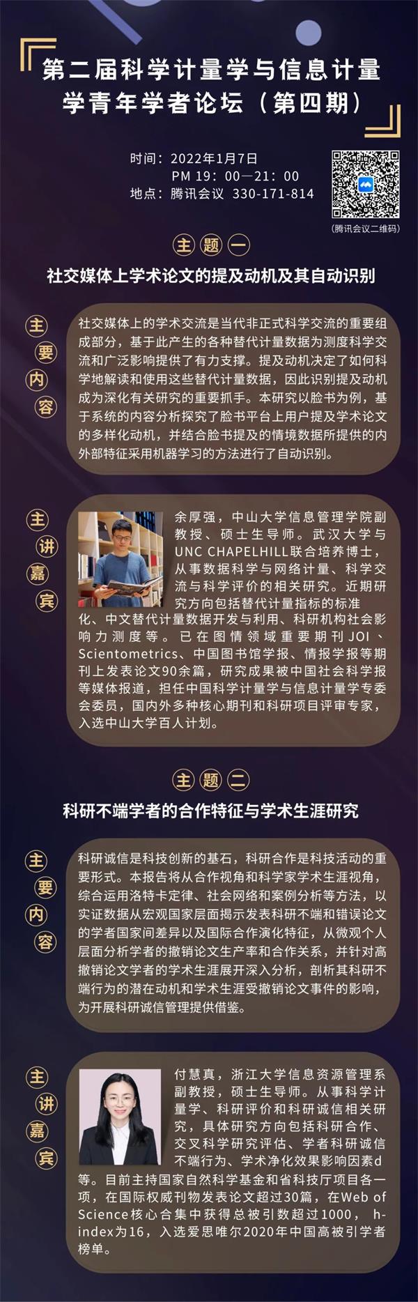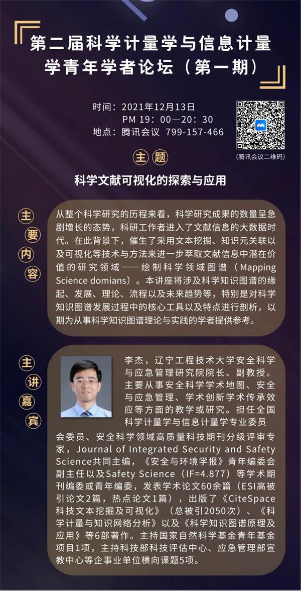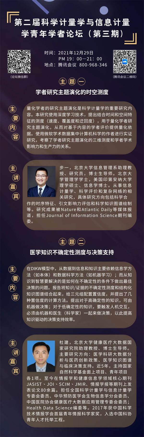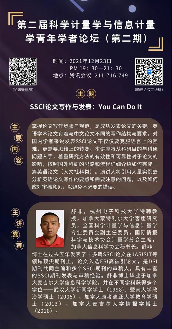 近日,第二屆科學計量學與信息計量學青年學者論壇圓滿落幕。本次論壇由中國科學與科技政策研究會、全國科學計量學與信息計量學專業委員會主辦,杭州電子科技大學中國科教評價研究院、管理學院,武漢大學中國科學評價研究中心承辦。論壇包括系列報告,分期進行,第一期于2021年12月13日在線上舉辦,在疫情影響的特殊時期,聚集國內外領域青年才俊,旨在提供一個在線的學術交流平臺,共同探討領域前沿問題。《圖書情報知識》、《圖書情報工作》、《圖書館論壇》、《農業圖書情報學報》、“圖情會”公眾號等提供了媒體支持。