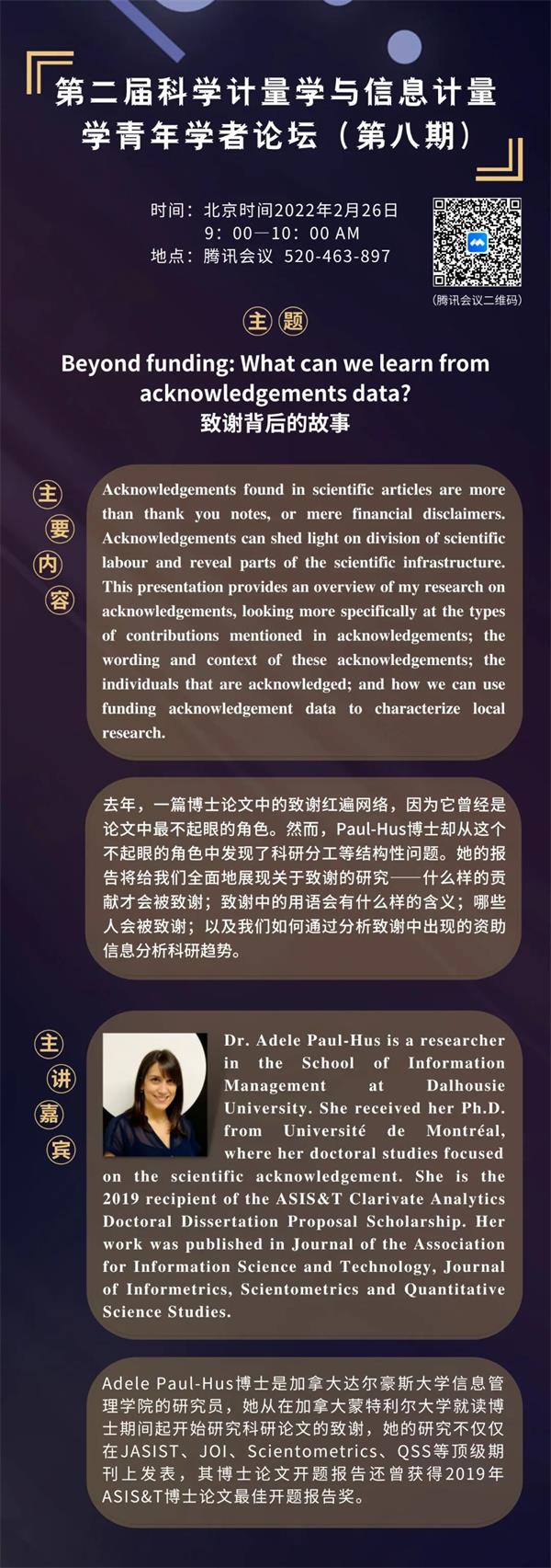 論壇分為8期,圍繞“信息計量與科學評價:新時期、新需求、新發展”的主題,邀請了11位青年學者。李杰副教授、舒非教授、步一副教授、杜建副教授、余厚強副教授、傅慧真副教授、KEVIN博士、吳金閃教授、劉曉娟教授、ADELE博士、KYLE博士等來自北京大學、浙江大學、中山大學、遼寧工程技術大學、杭州電子科技大學、達爾豪斯大學、蒙特利爾大學等高校的代表進行了學術報告,主題新穎、內容前沿、方法科學,充分展示了信息計量與科學評價領域的風采。值得一提的是,本次論壇邀請了3位海外青年學者。楊思洛教授、宋艷輝教授、舒非教授、俞立平教授、丁敬達教授等主持了該論壇。