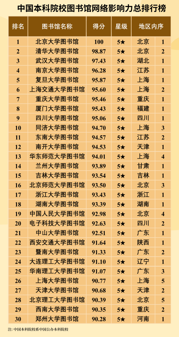 中國本科院校圖書館網絡影響力總排行榜中,共有850家高校圖書館參評,5★級圖書館85家,4★級圖書館85家,3★級圖書館255家,其中前十名分別為:北京大學圖書館、清華大學圖書館、武漢大學圖書館、南京大學圖書館、復旦大學圖書館、上海交通大學圖書館、重慶大學圖書館、廈門大學圖書館、四川大學圖書館、同濟大學圖書館。排名前三十如下表: