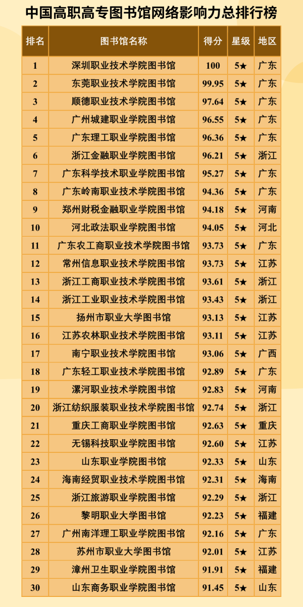 中國高職高專圖書館影響力排行榜中,共有1489家高職高專院校圖書館參評,5★級圖書館149家,4★級圖書館149家,其中前十名分別為:深圳職業技術學院圖書館、東莞職業技術學院圖書館、順德職業技術學院圖書館、廣州城建職業學院圖書館、廣東理工職業學院圖書館、浙江金融職業學院圖書館、廣東科學技術職業學院圖書館、廣東嶺南職業技術學院圖書館、鄭州財稅金融職業學院圖書館、河北政法職業學院圖書館。排名前三十如下表: