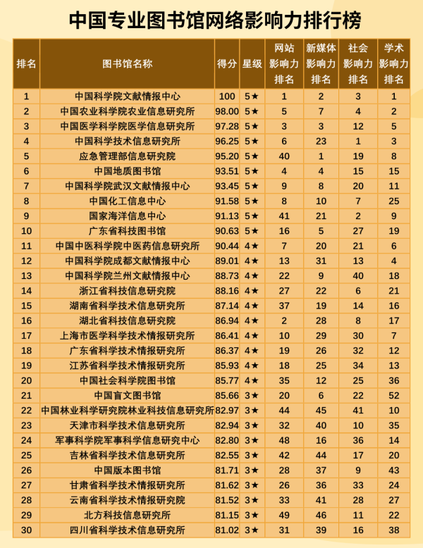 中國專業圖書館影響力排行榜中,5★級圖書館10家,4★級圖書館10家,3★級圖書館30家,其中前十名分別為:中國科學院文獻情報中心、中國農業科學院農業信息研究所、中國醫學科學院醫學信息研究所、中國科學技術信息研究所、應急管理部信息研究院、中國地質圖書館、中國科學院武漢文獻情報中心、中國化工信息中心、國家海洋信息中心、廣東省科技圖書館。排名前三十如下表: