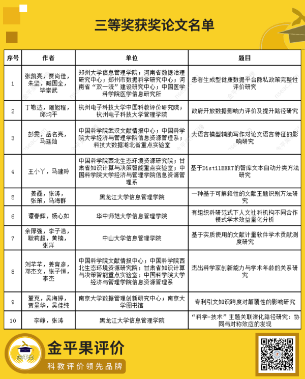 第十六屆全國科學計量學與科教評價研討會于2025年7月14-16日在蘭州舉辦,此次會議共產生16篇獲獎論文,其中二等獎6篇,三等獎10篇。具體名單見下表。