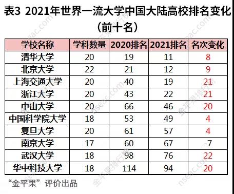 2021年世界頂尖大學(xué)增加一所,華中科技大學(xué)首次進(jìn)入世界一流大學(xué)百強(qiáng);前10名的中國大學(xué)中有9所高校排名明顯提升,武大、浙大、上海交大、中山大學(xué)、華中科大上升20名以上;中國高校在前600強(qiáng)中占比穩(wěn)中有升!