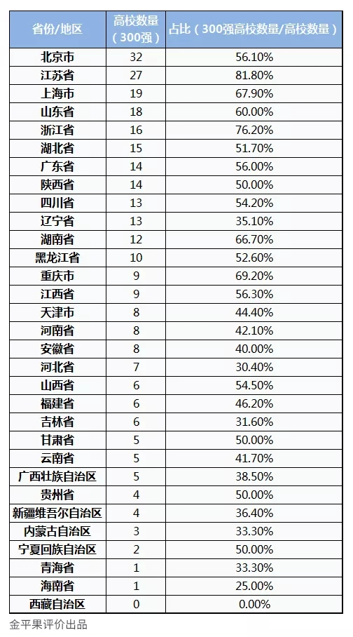 如表2所示,我們統(tǒng)計(jì)了300強(qiáng)高校數(shù)量及各省(市、自治區(qū))的占比情況。北京市的高校數(shù)量位居第一名,有32所高校進(jìn)入300強(qiáng);江蘇省是教育強(qiáng)省,以27所高校位列第二名,全省81.8%的高校進(jìn)入300強(qiáng),占比位列第1位;浙江省只有16所高校進(jìn)入300強(qiáng),但占比達(dá)到76.2%,位于第2名;上海市有19所高校進(jìn)入300強(qiáng),全市67.9%的高校進(jìn)入300強(qiáng)。從300強(qiáng)高校數(shù)量來(lái)看,北京市進(jìn)入的高校數(shù)量最高,但從整體分布來(lái)看,北京市進(jìn)入300強(qiáng)的高校只有56.1%,占比排名位列第8位,北京市總體數(shù)量較高,但高校質(zhì)量分布兩極分化較大。相對(duì)而言,江西省、重慶市進(jìn)入300強(qiáng)高校數(shù)量低于10所,但占比均高于56%,總體學(xué)校數(shù)量較少,但整體學(xué)校質(zhì)量較高。