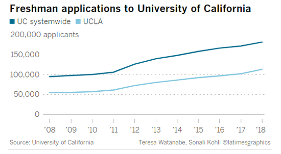 【環球網教育綜合報道】據美國媒體《洛杉磯時報》近日報道,加州大學洛杉磯分校(UCLA)刷新了由自己保持的紀錄,再次成為申請人數最多的美國高校。據初步篩選,UCLA收到了超過11萬3千份合格的2018年秋季學期入學申請。