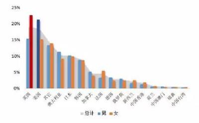 從最近一次留學(xué)國家/地區(qū)分布占比情況看,去英國和美國留學(xué)的人最多,占比分別為19%和18%。其中,女性更青睞英國,占比高達22%,其次是美國;而男性恰恰相反,21%的男性選擇美國。