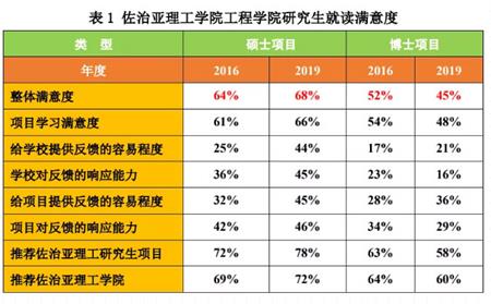 調查報告分析了各院系研究生就讀體驗的滿意度。2019年工程學院碩士項目和博士項目研究生的就讀整體滿意度分別為68%和45%,碩士項目的學生就讀滿意度高于學校整體滿意度,博士項目的學生就讀滿意度低于學校整體滿意度,具體如表1所示。