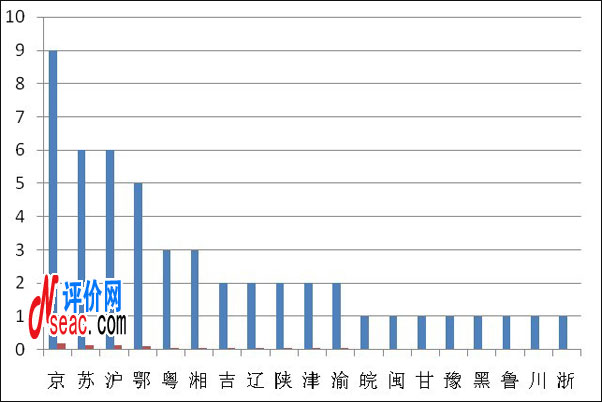 通過考察前50強高校的省區分布情況以及各個省區的得分情況,我們可以發現與2010年的情況類似,北京、湖北、上海以及江蘇四個省市的高校數量涵蓋了52%。其中北京占有9所高校。詳細情況見圖2。我們還可發現全國31個省、直轄市、自治區中,還有12個地區尚沒有1所高校進入前50強,而且這12個地區的經濟實力相對較為落后,大多分布在我國的西部,而浙江、安徽、黑龍江、山東、福建、甘肅、河南、四川均只有一所高校入圍。這也進一步印證了全國研究生教育實力的區域分布不均勻的現實情況。 |