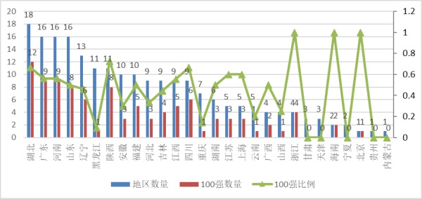 | 經濟區域 | 民辦高校數 | 百強數 | 百強比 | 區域榜首 | 區域第二 | 區域第三 |