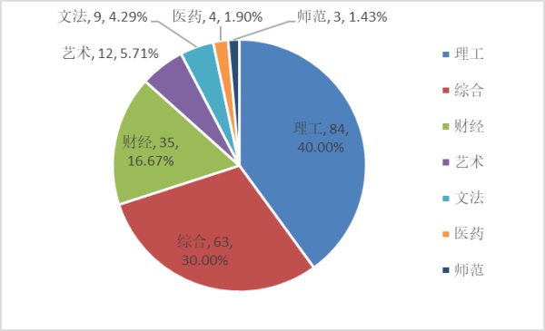從類型分布(圖2)來看,210所民辦院校分布在七大類型,其中理工、綜合、財經類高校占絕大多數,各有84、63、35所,分別為總數的40%、30%和16.67%。