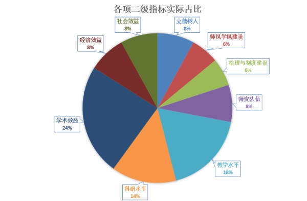 在觀測點的選擇上,首先,舍棄了SCI的數(shù)量指標,僅保留其被引數(shù)據(jù),作為科研質(zhì)量的觀測點之一。其次,豐富了科研質(zhì)量的觀測指標,新加入了高質(zhì)量期刊論文指標。最后,還新選用了教育部公布的國家一流本科專業(yè)數(shù)和國家級一流課程數(shù)的觀測點,突出本科培養(yǎng)及教學質(zhì)量;同時,采用了2020年中國高考錄取分數(shù)線的觀測點,以提高生源質(zhì)量的比重。表1是2021年中國本科院校競爭力評價指標體系,其中各項二級指標實際占比情況如圖1所示。學術效益占比24%,最為突出。