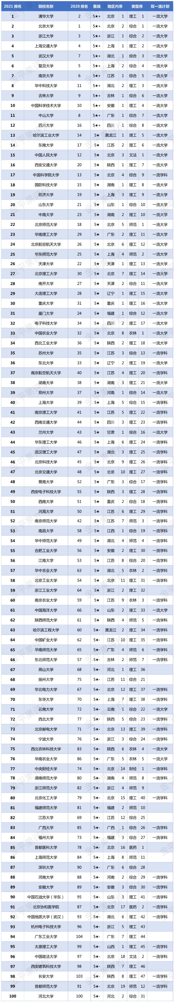 2021年的評價結(jié)果顯示,清華大學、北京大學、浙江大學仍然穩(wěn)居前三,隨后依次是上海交通大學、武漢大學、復旦大學、南京大學、華中科技大學、吉林大學、中國科學技術大學,中山大學和四川大學,這12所大學為頂尖大學(5★+)。