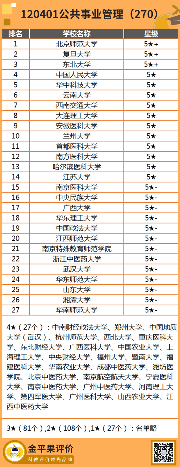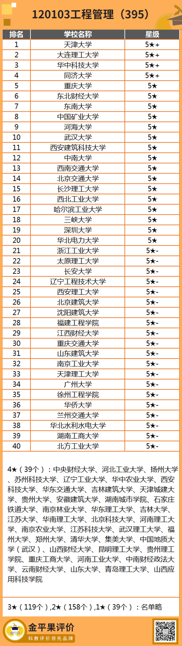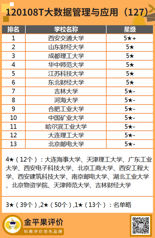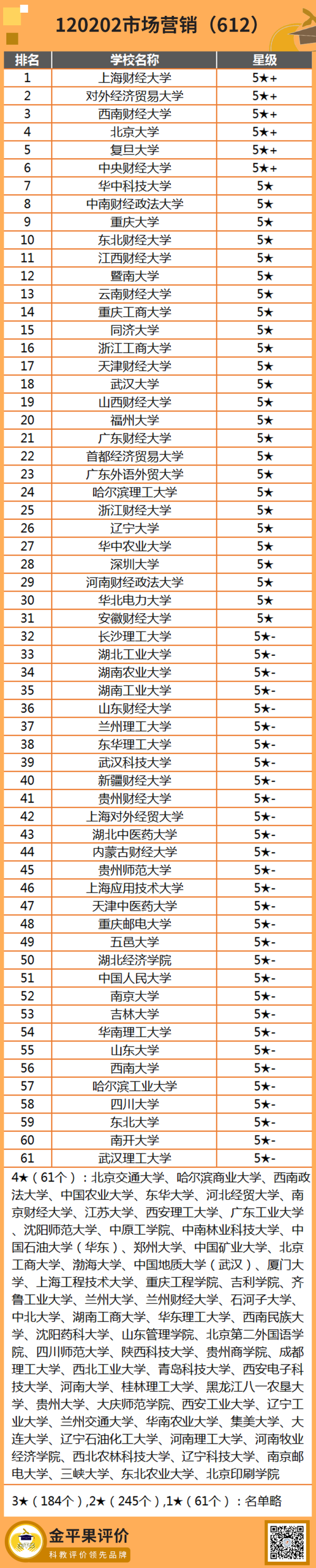 2022年“金平果”發布的《中國大學及學科專業評價報告》共公布了442個專業排行榜,其中涉及到管理學類排行榜有47個。這里公布了開設院校數量在100所院校以上的管理學專業排名情況,其中5★+為排名前1%的院校,5★為排名前1%-5%的院校,5★-為排名前5%-10%的院校。5★為一流專業,4★為一流培育專業。具體名單如下所示,更多榜單請關注中國科教評價網(m.ssjzs.com)。