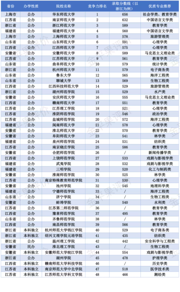 華東地區師范類院校有48所,綜合實力排名第一的是位于上海的華東師范大學,其2020年在浙江的錄取分數線是656分,推薦的優質專業主要是社會學類和教育學類。排名第二是南京師范大學,其2020年在浙錄取分數線是632分,優質專業推薦是中國語言文學類。具體情況如下表所示。