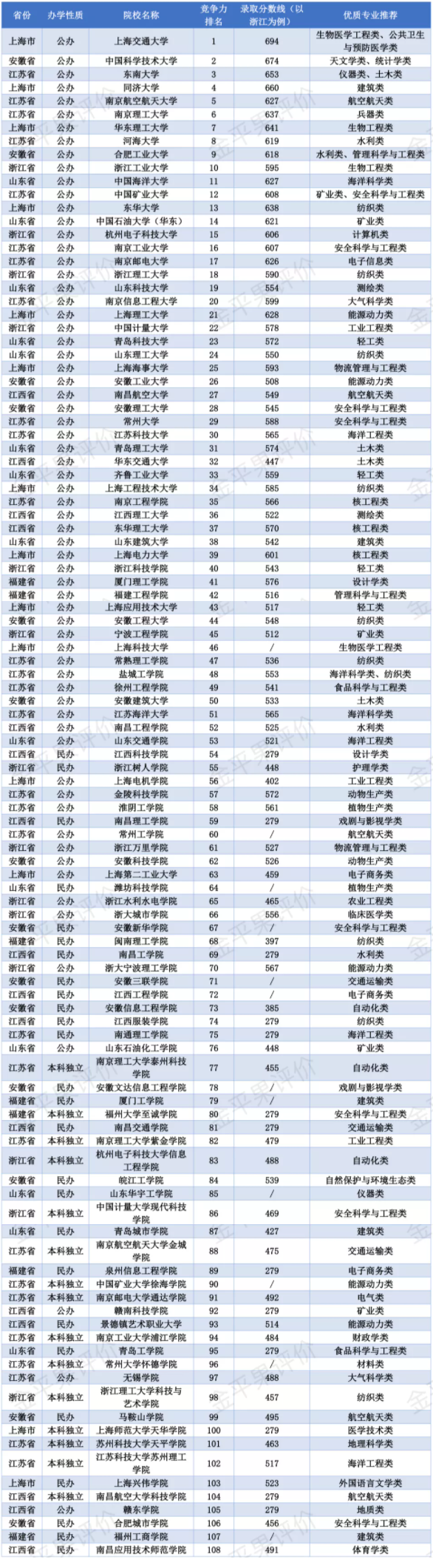 華東地區(qū)理工類院校有108所,綜合實力排名第一的是上海交通大學,其2020年在浙江的錄取分數線是694分,推薦的優(yōu)質專業(yè)主要是生物醫(yī)學工程類、公共衛(wèi)生與預防醫(yī)學類。排名第二是中國科學技術大學,其2020年在浙錄取分數線是632分,優(yōu)質專業(yè)推薦是天文學類和統(tǒng)計學類。具體情況如下表所示。