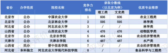 臨近高考志愿填報關鍵期,中國科教評價研究院將陸續推出《大學排名與高考志愿指南》的院校篇和專業篇。 ![]() 其中院校篇分為華東、華北、華中、華南、東北、西南、西北七個篇章,囊括了全國31個省市自治區,共1230所高校的競爭力排名情況、去年錄取分數線以及優質專業推薦等重要信息。每個篇章依據學校類型依次分為綜合類、財經類、師范類、理工類、醫藥類和農林類。因獨立學院轉設問題,部分獨立學院的辦學性質和院校名稱仍沿用原名稱。專業篇依據麥可思研究院發布的《2020年中國大學生就業報告》選出就業薪酬排名前十的熱門專業類做一個院校大盤點,主要涉及計算機類、電子信息類、自動化類、儀器類、電子商務類、金融學類、交通運輸類、管理科學與工程類、數學類、財政學類。相關內容將會陸續推出,敬請期待! 專家建議: 志愿填報是人生的一個重要選擇,涉及了院校選擇(發展城市)、專業選擇(競爭跑道)等。總體上建議考生應結合自身的未來發展規劃、性格天賦、興趣導向來報考。但對不同分數段考生,我們也提供了以下一些建議: 1、高分段(一般是一本線20分以上)學生建議以院校優先考慮,爭取進入實力較強的院校,專業如不滿意還可以爭取轉專業的機會。 2、中低分段(一般是本科線到一本線)學生建議專業優先考慮,進入一個自己有優勢,與自己未來職業規劃更匹配的專業,在擅長的領域實現彎道超車。 3、無論采用哪種選擇策略,都要注意設置志愿方案的沖、穩、保梯度,控制風險。 4、獨立學院轉公的,分數預計會上升;轉民辦的,分數預計會有所下降;轉設方案未定的,可能會出現分數波動,有可能出現撿漏的機會。 華北地區囊括了整個京津翼地區和山西省及部分內蒙古自治區,是我國高等教育重鎮。其中,北京市是華北地區高等教育力量的集中地,共有64所本科高校,清華、北大等知名高校代表我國一流大學的建設水平。 華北地區以北京地區的錄取分數線為例,分為理工類和文史類,其理工類院校共8所。綜合實力競爭力排名第一的高校是中國農業大學,錄取分數線是606分,其優質專業推薦主要是農業工程類。具體情況如下表所示。 報考建議:不同分數段的考生要綜合考慮城市+院校+專業組合的優先順序,找出最優解。致力于報考農林類院校的考生建議以自己感興趣的專業為優先考慮因素。 華北地區農林類院校排名情況 ![]()