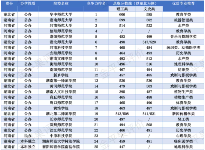臨近高考志愿填報關鍵期,中國科教評價研究院將陸續推出《大學排名與高考志愿指南》的院校篇和專業篇。 ![]() 其中院校篇分為華東、華北、華中、華南、東北、西南、西北七個篇章,囊括了全國31個省市自治區,共1230所高校的競爭力排名情況、去年錄取分數線以及優質專業推薦等重要信息。每個篇章依據學校類型依次分為綜合類、財經類、師范類、理工類、醫藥類和農林類。因獨立學院轉設問題,部分獨立學院的辦學性質和院校名稱仍沿用原名稱。專業篇依據麥可思研究院發布的《2020年中國大學生就業報告》選出就業薪酬排名前十的熱門專業類做一個院校大盤點,主要涉及計算機類、電子信息類、自動化類、儀器類、電子商務類、金融學類、交通運輸類、管理科學與工程類、數學類、財政學類。相關內容將會陸續推出,敬請期待! 專家建議: 志愿填報是人生的一個重要選擇,涉及了院校選擇(發展城市)、專業選擇(競爭跑道)等。總體上建議考生應結合自身的未來發展規劃、性格天賦、興趣導向來報考。但對不同分數段考生,我們也提供了以下一些建議: 1、高分段(一般是一本線20分以上)學生建議以院校優先考慮,爭取進入實力較強的院校,專業如不滿意還可以爭取轉專業的機會。 2、中低分段(一般是本科線到一本線)學生建議專業優先考慮,進入一個自己有優勢,與自己未來職業規劃更匹配的專業,在擅長的領域實現彎道超車。 3、無論采用哪種選擇策略,都要注意設置志愿方案的沖、穩、保梯度,控制風險。 4、獨立學院轉公的,分數預計會上升;轉民辦的,分數預計會有所下降;轉設方案未定的,可能會出現分數波動,有可能出現撿漏的機會。 華中地區包含河南省、湖北省和湖南省。其中,湖北省高校有68所,數量上是除江蘇省外,我國第二大高等教育大省。而2021年河南省高考報名人數以125萬的穩居第一,超過山東省約45萬人。 華中地區以湖北省的錄取分數線為例,分為理工類和文史類,其師范類院校共25所。綜合競爭力排名第一的華中師范大學錄取分數線分別是606分(理工)和585分(文史),其優質推薦專業是教育學類,并且是6所免費師范生教育院校之一。綜合競爭力排名第二的湖南師范大學錄取分數線分別是599分(理工)和582分(文史),其優質推薦專業是旅游管理類。具體情況如下表所示。 報考建議:位于500分左右的考生,謹慎選擇報考院校,謹防出現報考扎堆現象,建議擴大報考院校地區或擴展院校類型。不同分數段的考生要綜合考慮城市+院校+專業組合的優先順序,找出最優解。 華中地區師范類院校排名情況 ![]()