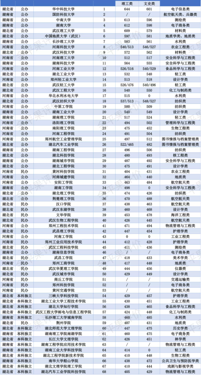 臨近高考志愿填報關(guān)鍵期,中國科教評價研究院將陸續(xù)推出《大學(xué)排名與高考志愿指南》的院校篇和專業(yè)篇。 ![]() 其中院校篇分為華東、華北、華中、華南、東北、西南、西北七個篇章,囊括了全國31個省市自治區(qū),共1230所高校的競爭力排名情況、去年錄取分?jǐn)?shù)線以及優(yōu)質(zhì)專業(yè)推薦等重要信息。每個篇章依據(jù)學(xué)校類型依次分為綜合類、財經(jīng)類、師范類、理工類、醫(yī)藥類和農(nóng)林類。因獨立學(xué)院轉(zhuǎn)設(shè)問題,部分獨立學(xué)院的辦學(xué)性質(zhì)和院校名稱仍沿用原名稱。專業(yè)篇依據(jù)麥可思研究院發(fā)布的《2020年中國大學(xué)生就業(yè)報告》選出就業(yè)薪酬排名前十的熱門專業(yè)類做一個院校大盤點,主要涉及計算機類、電子信息類、自動化類、儀器類、電子商務(wù)類、金融學(xué)類、交通運輸類、管理科學(xué)與工程類、數(shù)學(xué)類、財政學(xué)類。相關(guān)內(nèi)容將會陸續(xù)推出,敬請期待! 專家建議: 志愿填報是人生的一個重要選擇,涉及了院校選擇(發(fā)展城市)、專業(yè)選擇(競爭跑道)等。總體上建議考生應(yīng)結(jié)合自身的未來發(fā)展規(guī)劃、性格天賦、興趣導(dǎo)向來報考。但對不同分?jǐn)?shù)段考生,我們也提供了以下一些建議: 1、高分段(一般是一本線20分以上)學(xué)生建議以院校優(yōu)先考慮,爭取進入實力較強的院校,專業(yè)如不滿意還可以爭取轉(zhuǎn)專業(yè)的機會。 2、中低分段(一般是本科線到一本線)學(xué)生建議專業(yè)優(yōu)先考慮,進入一個自己有優(yōu)勢,與自己未來職業(yè)規(guī)劃更匹配的專業(yè),在擅長的領(lǐng)域?qū)崿F(xiàn)彎道超車。 3、無論采用哪種選擇策略,都要注意設(shè)置志愿方案的沖、穩(wěn)、保梯度,控制風(fēng)險。 4、獨立學(xué)院轉(zhuǎn)公的,分?jǐn)?shù)預(yù)計會上升;轉(zhuǎn)民辦的,分?jǐn)?shù)預(yù)計會有所下降;轉(zhuǎn)設(shè)方案未定的,可能會出現(xiàn)分?jǐn)?shù)波動,有可能出現(xiàn)撿漏的機會。 華中地區(qū)包含河南省、湖北省和湖南省。其中,湖北省高校有68所,數(shù)量上是除江蘇省外,我國第二大高等教育大省。而2021年河南省高考報名人數(shù)以125萬的穩(wěn)居第一,超過山東省約45萬人。 華中地區(qū)以湖北省的錄取分?jǐn)?shù)線為例,分為理工類和文史類,其理工類院校共68所。綜合競爭力排名第一的華中科技大學(xué)錄取分?jǐn)?shù)線分別是644分(理工)和601分(文史),其優(yōu)質(zhì)推薦專業(yè)是電子信息類,從理工類和文史類的錄取分?jǐn)?shù)線來看,華中科技大學(xué)文史類專業(yè)錄取分?jǐn)?shù)線較低,位于此分?jǐn)?shù)段的學(xué)生可優(yōu)先考慮其文史類專業(yè)。綜合競爭力排名第二的國防科技大學(xué),該院校是軍事類院校,主要推薦專業(yè)是航空航天類和兵器類。具體情況如下表所示。 報考建議:位于600分左右的考生,謹(jǐn)慎選擇報考院校,謹(jǐn)防出現(xiàn)報考扎堆現(xiàn)象,建議擴大報考院校地區(qū)或擴展院校類型,也可選擇理工類院校中的文史類專業(yè)。不同分?jǐn)?shù)段的考生要綜合考慮城市+院校+專業(yè)組合的優(yōu)先順序,找出最優(yōu)解。 華中地區(qū)理工類院校排名情況 ![]()
