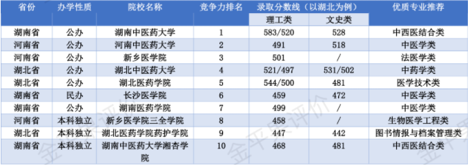 華中地區以湖北省的錄取分數線為例,分為理工類和文史類,其醫藥類院校共10所。綜合競爭力排名第一的湖南中醫藥大學錄取分數線分別是583/520分(理工)和528分(文史),其優質推薦專業是中西醫結合類。綜合競爭力排名第二的河南中醫藥大學,該院校是錄取分數線分別是491分(理工)和518分(文史類),主要推薦專業是中醫學類。具體情況如下表所示。